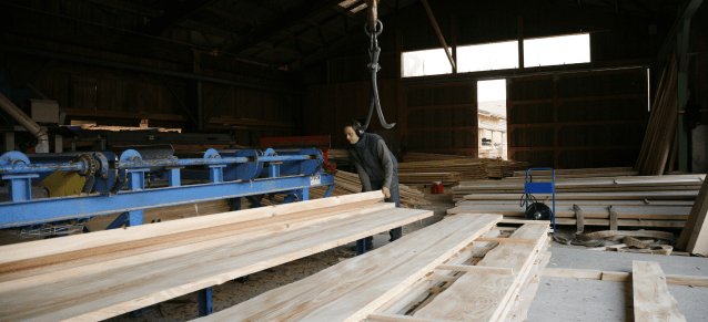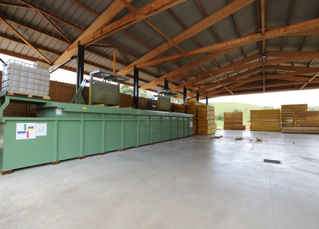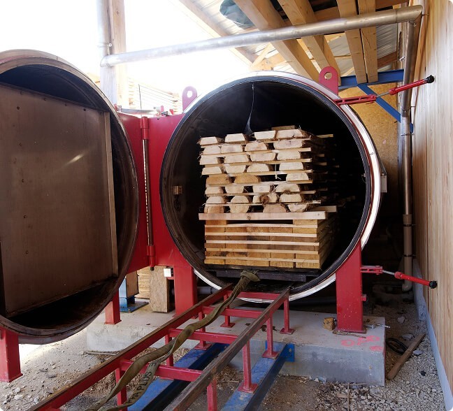 Selon son utilisation, en agencement intérieur par exemple, le bois doit être très sec si on veut qu’il reste stable dans le temps. À la scierie Maugain, nous obtenons un séchage homogène en combinant le séchage naturel à l’air libre et le séchage en cellule sous vide. Lors de la première étape, l’humidité du bois passe de 70% à 30%. Ce taux est encore trop élevé, et ne répond pas à la réglementation qui s’impose dans la réalisation de certains ouvrages. Nous avons donc investi dans une cellule de séchage sous vide. La structure, en forme de tunnel, est une enceinte hermétique qui accélère la migration de l’eau contenue dans le bois et qui intensifie le phénomène d’évaporation sous l’effet d’une diminution de la pression. Le cycle dure de 3 à 5 jours au terme duquel le taux d’humidité dans le bois s’établit à 12%. Le tunnel de séchage est suffisamment grand pour sécher toutes les sections jusqu’à 12 mètres de long.
